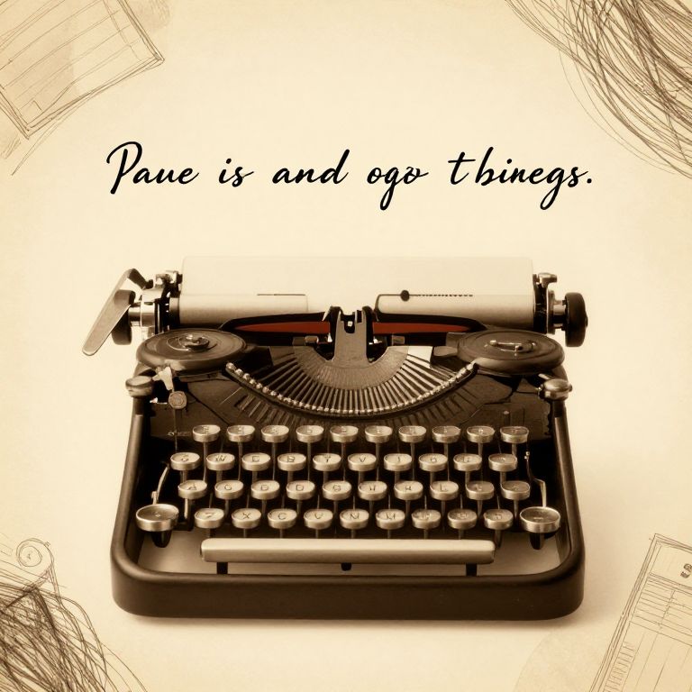 A sepia-toned digital illustration features a vintage black typewriter with silver keys and circular knobs, centrally positioned against a white background. The typewriter has a classic, retro design with visible ribbed texture on the platen. Surrounding the typewriter are faintly sketched, angular lines in the corners, adding a sense of depth. Above the typewriter, in elegant, cursive black text, are the words "Pain is and og time." The overall style evokes a nostalgic, old-world feel with a focus on the typewriter's intricate details and the timeless message.