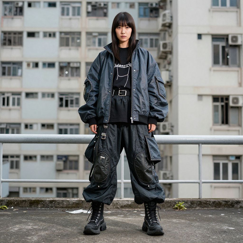 Photograph of an Asian woman with straight black hair and bangs, standing on a rooftop against a backdrop of a tall, beige apartment building with numerous windows. She wears a black "Off-White" graphic t-shirt, a large, dark blue, puffer jacket with multiple pockets, and baggy black cargo pants with visible stitching. Her black combat boots have thick soles. She stands with her hands by her sides, looking directly at the camera. The rooftop has a metal railing and some small plants near the edge. The overall style is urban and edgy, with a focus on bold, layered clothing.