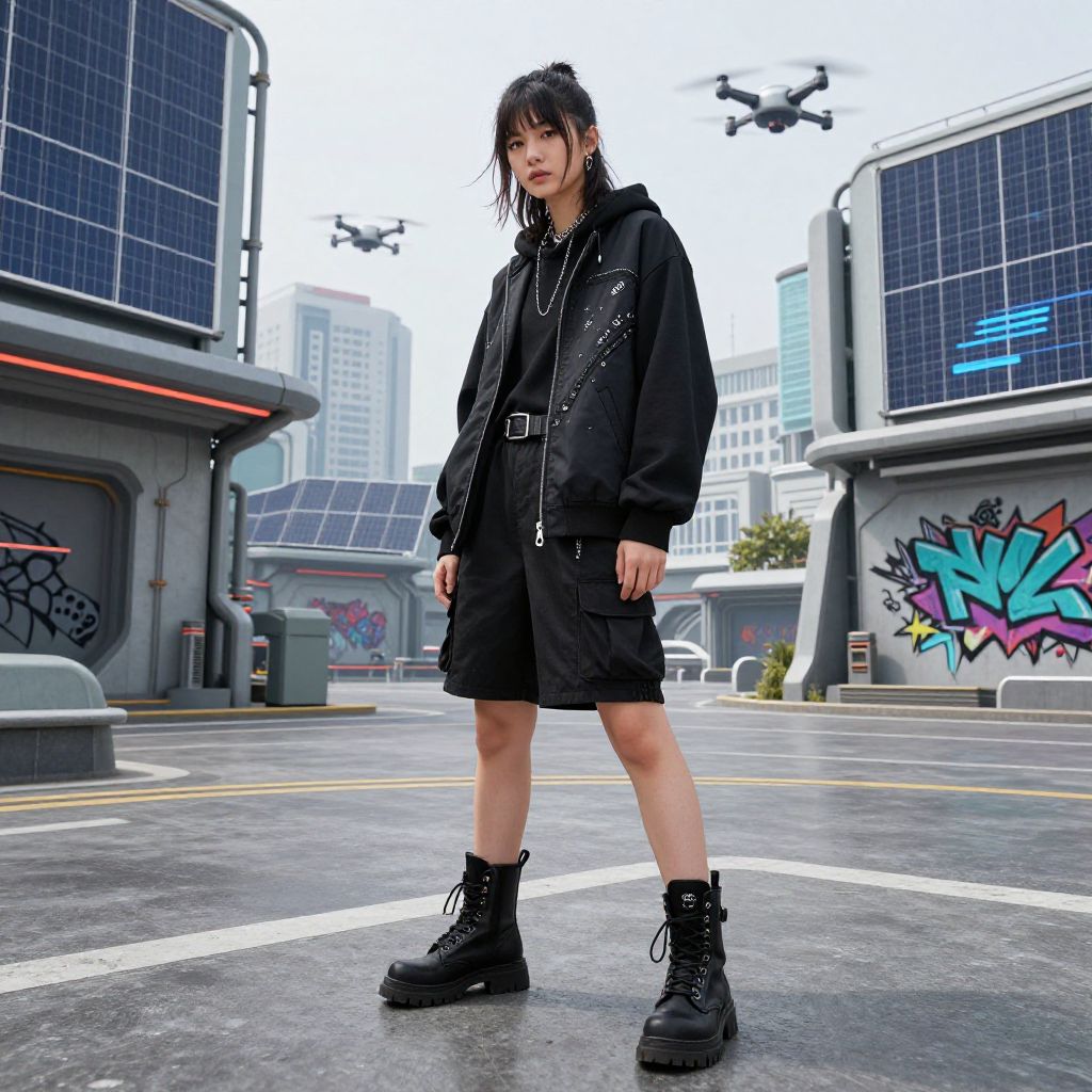 Photograph of an Asian woman with straight black hair, wearing a black shirt, oversized black jacket, cargo pants, and combat boots, standing in front