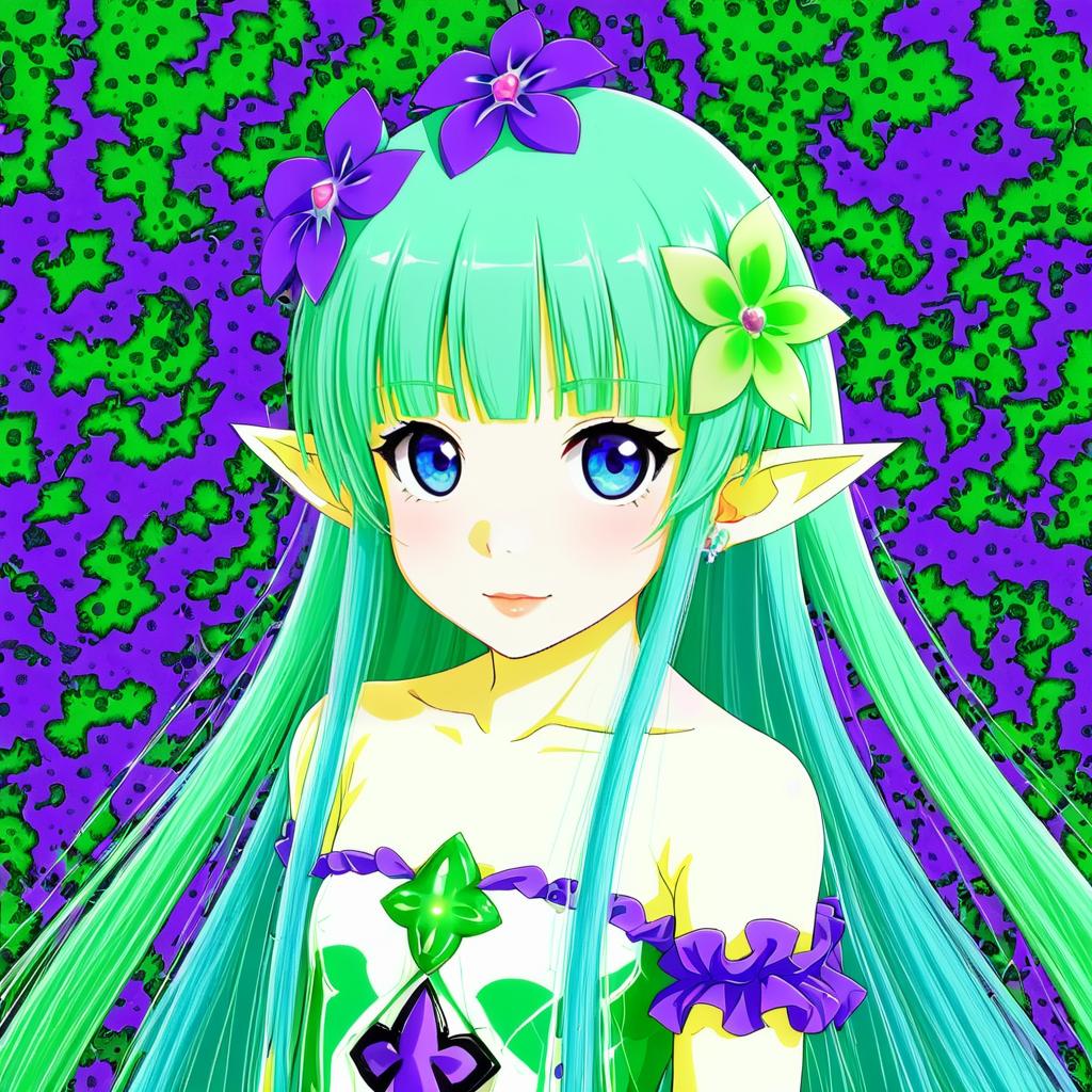 Anime-style illustration of a female elf character with long green hair adorned with purple and green flowers. She has large blue eyes, pointed ears, bare shoulders, and wears a decorative outfit with purple ruffles and green accents. The vibrant background features abstract green and purple patterns.