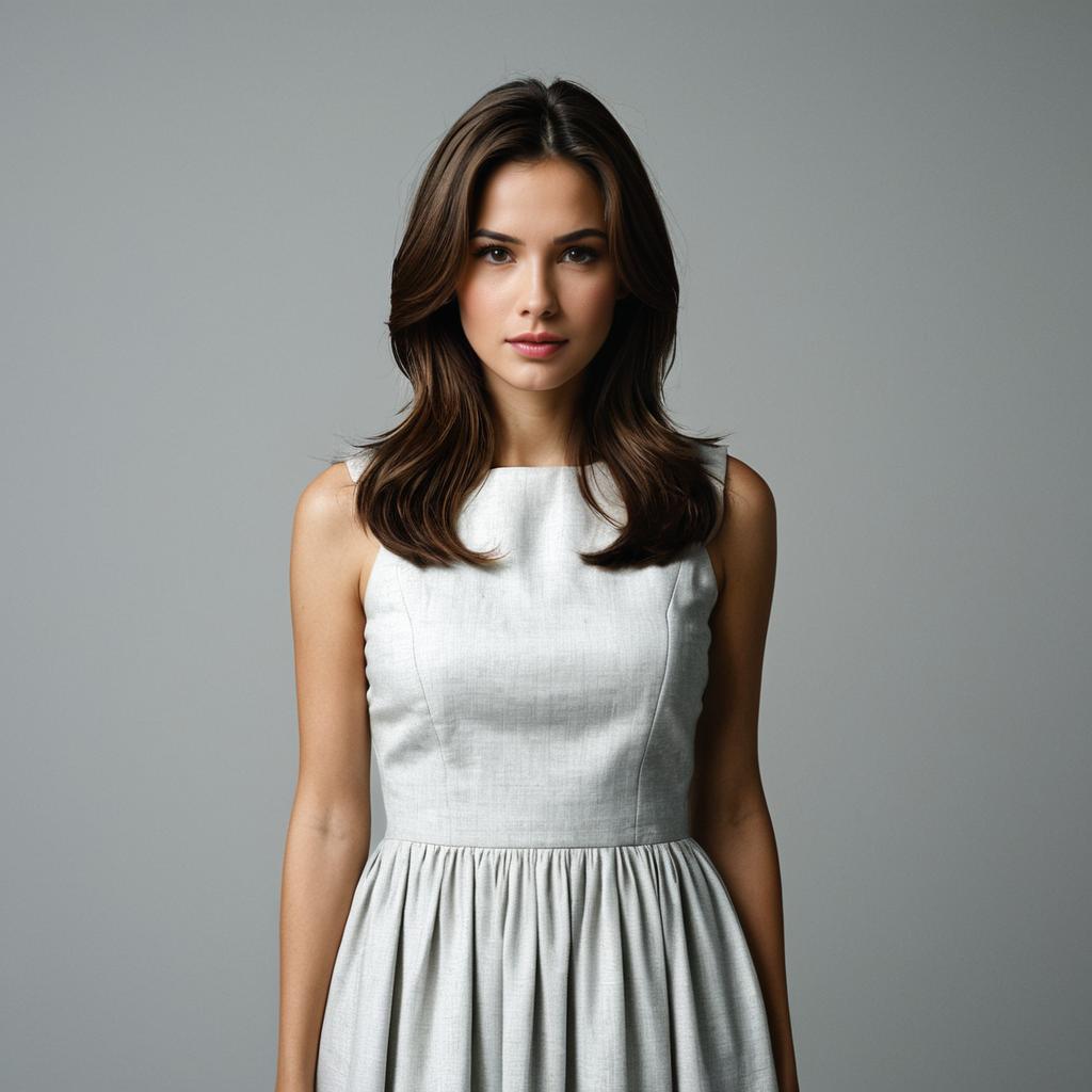 Frock top woman,1girl, solo, realistic, brown hair, upper body, looking at viewer, lips, photorealistic, simple background