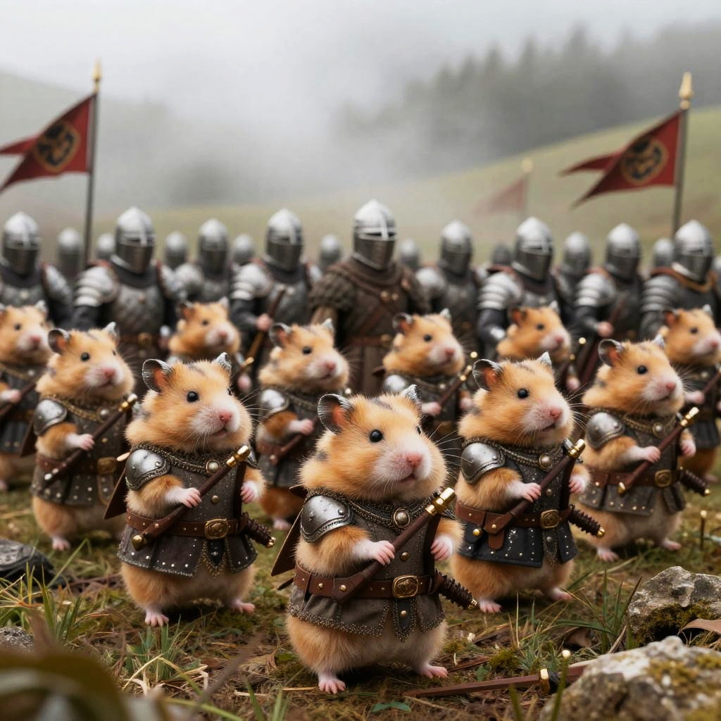 Hamster army in medieval armor, lined up for battle in a misty valley, each hamster detailed with personalized gear, banners waving in the background, epic fantasy style with dramatic lighting and an epic sense of scale and courage.