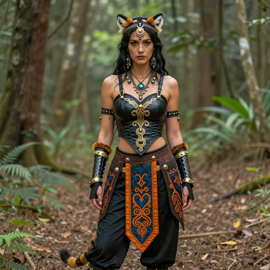 Tigress temptation woman, photo of a woman standing in a forest, fantasy cosplay, detailed armor, black leather corset with gold patterns, black pants with intricate orange and blue designs, animal ear headpiece, long black hair, serious expression, forest background with trees and green plants, brown dirt path, full-body shot, realistic lighting, medium close-up, fantasy character, bohemian style, fantasy armor, ethnic jewelry, detailed ures, digital photo realism, cosplay outfit, forest setting
