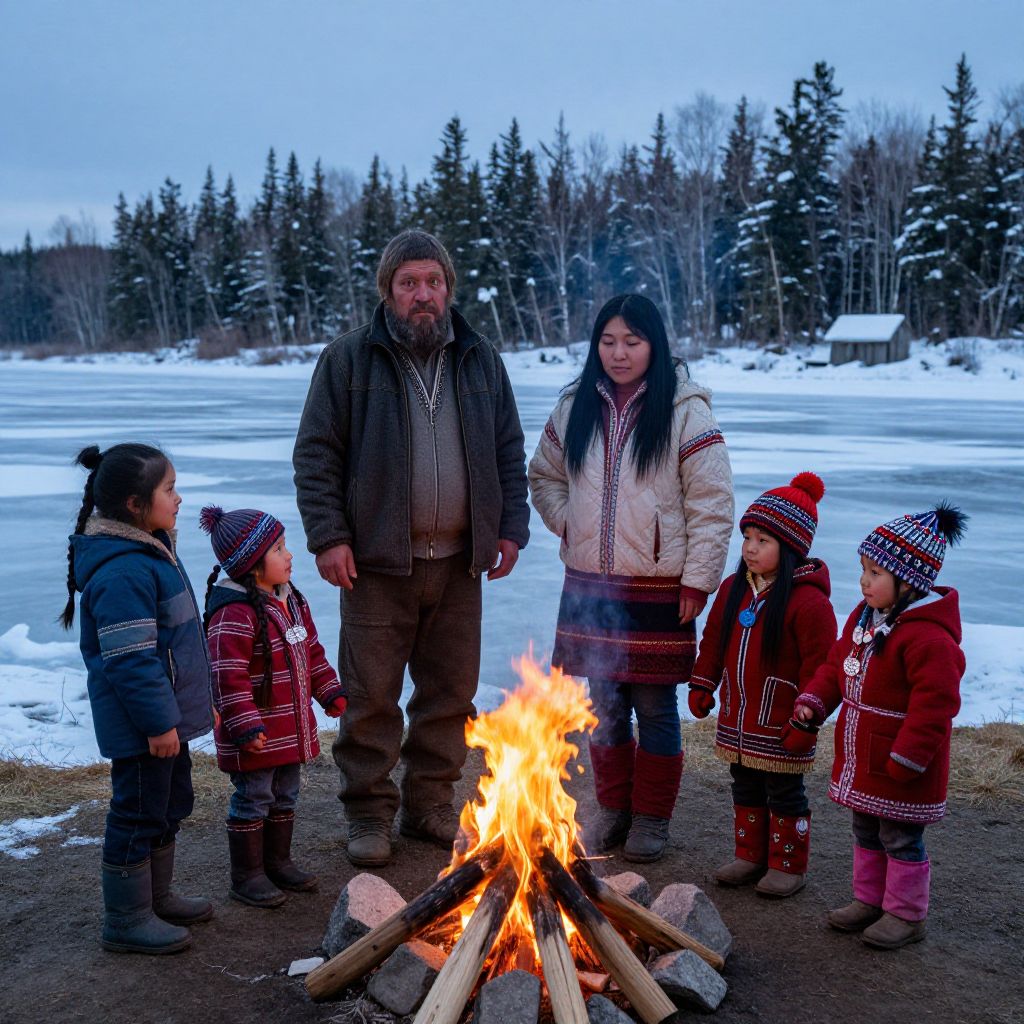 A realistic image of a family of indigenous people in a traditional longhouse in northern Canada, standing around a central fire at dusk, the man has a broad face with a beard and deep-set eyes, the woman has soft features and long black hair, children dressed in colorful handwoven clothes, with frozen lakes and snow-covered forests in the background, showing a peaceful daily life.
