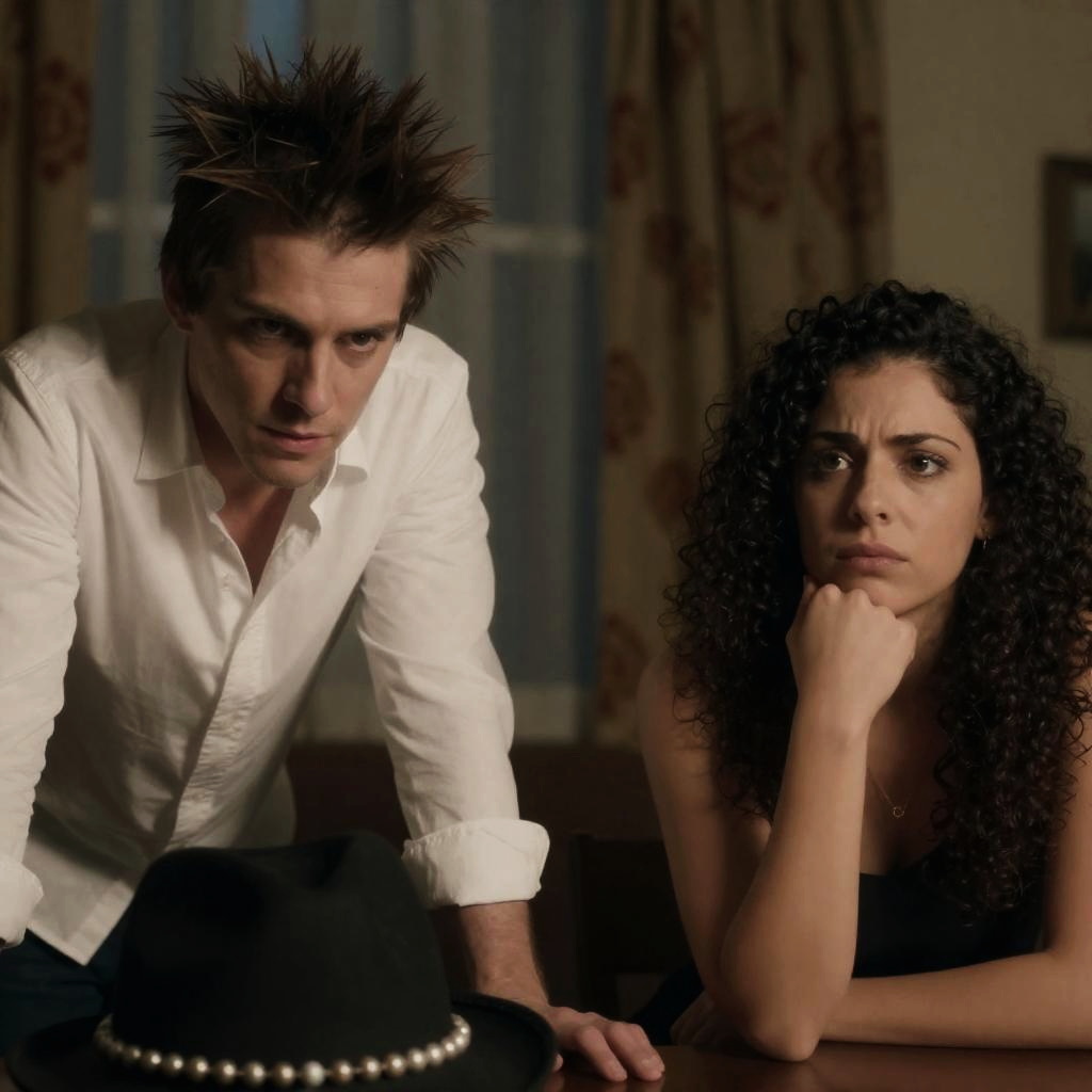 Photograph of a man with spiked dark hair wearing a white shirt leaning forward with an intense expression, and a woman with curly dark hair sitting next to him with her hand resting on her chin, looking concerned. A black hat with pearl decorations is in the foreground on the table. The scene takes place in a dimly lit room with patterned curtains in the background.