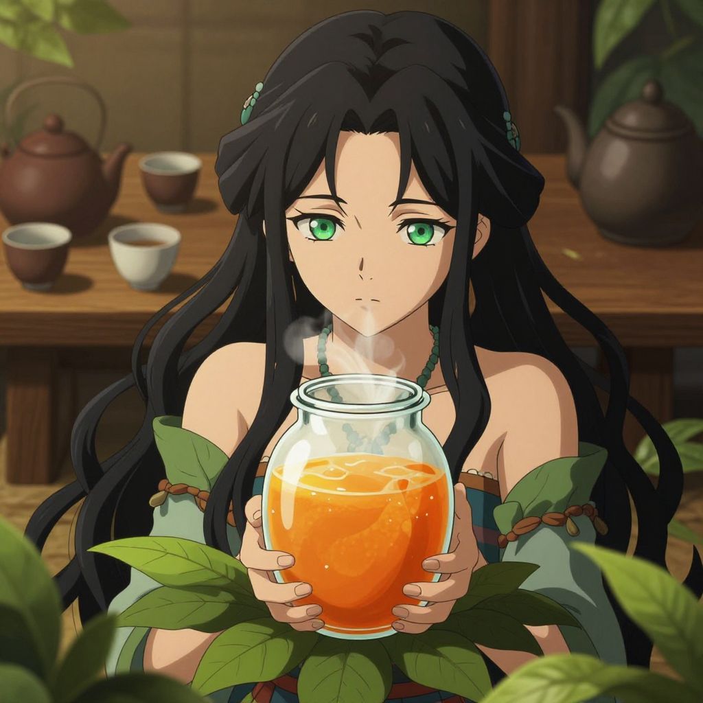 In this captivating anime-style illustration, a young woman with striking green eyes and long, flowing black hair adorned with intricate accessories is the focal point. She is depicted in a serene, contemplative pose, gently holding a steaming glass jar filled with a vibrant orange liquid, likely representing ayahuasca tea. The jar is surrounded by lush green leaves and plants, adding a sense of nature and tranquility to the scene. The background features a wooden table with various cups and a teapot, suggesting a setting for a traditional tea ceremony. The interplay of light and shadow creates a warm, inviting atmosphere, highlighting the rich textures and detailed rendering of the objects. The overall composition is balanced, with the woman and the jar of tea centrally positioned, drawing the viewer's attention to the central theme of the illustration.