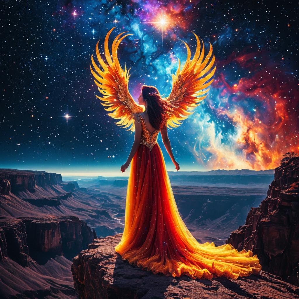 A striking celestial being resembling a phoenix stands on a rocky cliff, set against a vibrant and luminous cosmic nebula backdrop. The woman wears a flowing gown in fiery shades of orange, red, and yellow that seamlessly blend with the cosmic blue and purple hues of the nebula. Her large glowing wings resemble flames, and her hair intermingles with stardust, enhancing the ethereal and otherworldly atmosphere. The scene combines elements of fantasy and cosmic imagery captured in high resolution with intense detail.