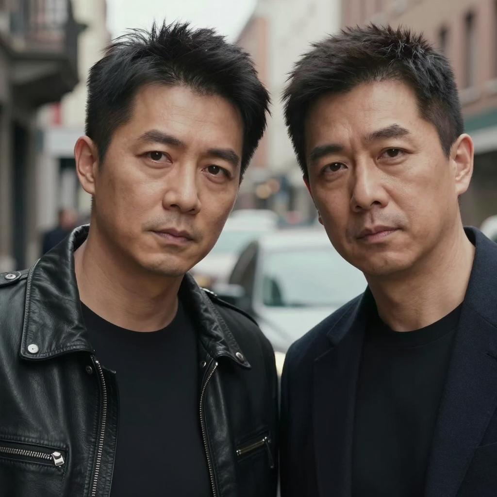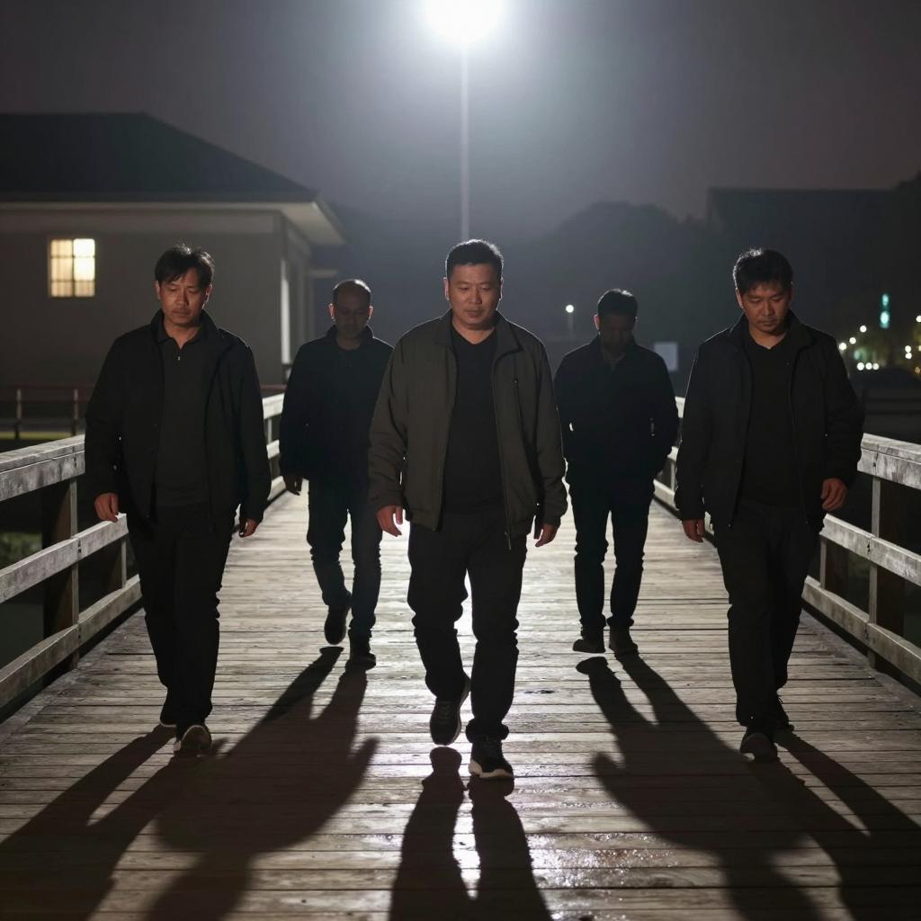 Nighttime photograph of five men walking across a wooden bridge. Central figure in the foreground wears a dark jacket and pants, with medium build and short hair. Other men in background wear similar dark clothing, with shadows and mist adding depth. Bright spotlight from above illuminates the bridge, casting long shadows. Background includes a dark building with faintly lit windows. Wet wooden planks reflect light.