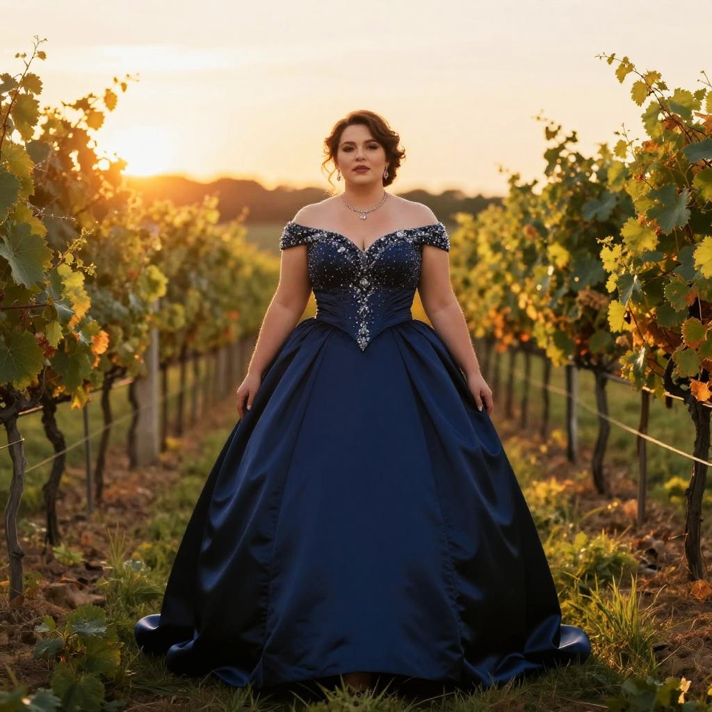 Photograph of a plus-sized woman with fair skin and curly brown hair, standing in a vineyard at sunset. She's wearing a stunning navy blue, off-the-shoulder ball gown with intricate silver embroidery on the bodice and a full, flowing skirt. The sun casts a warm golden glow, highlighting the grapevines on either side. She has a confident, poised expression, and her jewelry includes a delicate necklace and earrings.