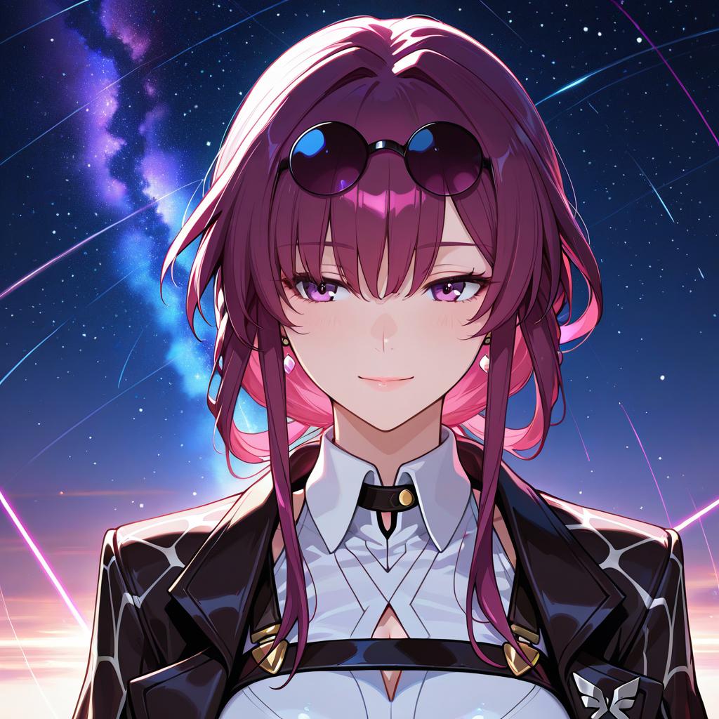1girl, bangs, closed mouth, eyewear on head, glasses, grey background, long hair, looking at viewer, portrait, purple hair, red hair, smile, solo, star-kafka, mature female, (masterpiece), (best quality)