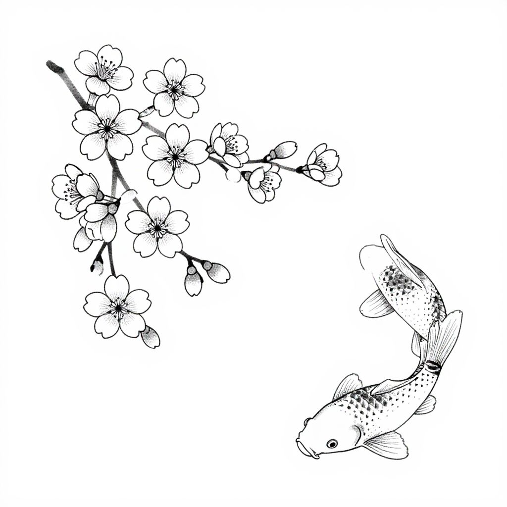 Black and white ink drawing of a cherry blossom branch with delicate flowers and a detailed koi fish swimming below.