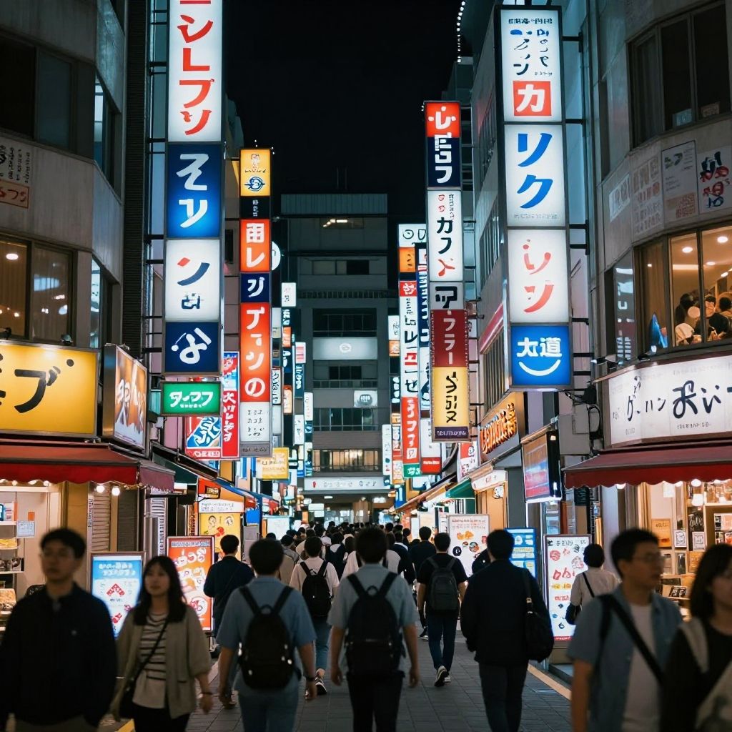 Tochio Night Street, full of neon signs and noisy crowd, - streets busy area at midnight, bright neon lights reflected from colorful billboards and posters on buildings, colorful atmosphere k ambience with walking people, hyperrealistic photography, high resolution, high detail, top quality snapshot of super realism hyper cinema