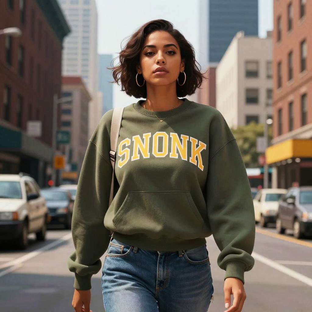 Photograph of a confident woman with wavy black hair, wearing a green "SNOOK" hoodie, blue jeans, and large hoop earrings,