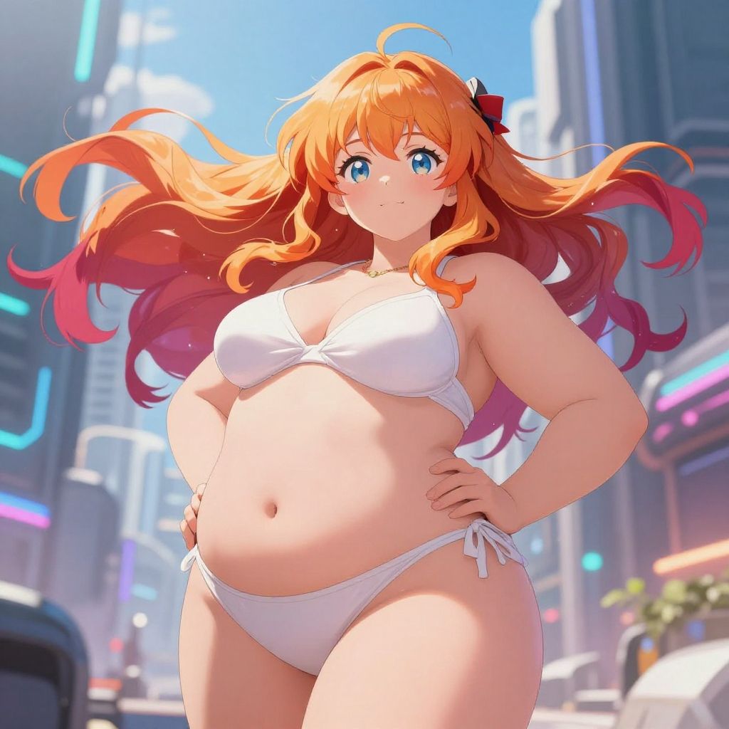 Digital anime-style illustration of a curvy, fair-skinned woman with long, flowing orange hair with pink tips. She wears a white bikini, highlighting her large breasts and slightly protruding belly. Her blue eyes are wide and expressive. She stands confidently with hands on hips in a brightly lit, futuristic city street with neon lights and blurred buildings in the background. The sky is clear blue, and there's a small plant on the right. Her expression is determined and slightly playful. The overall color palette is vibrant, with a strong contrast between her hair and the white bikini against the colorful urban backdrop.