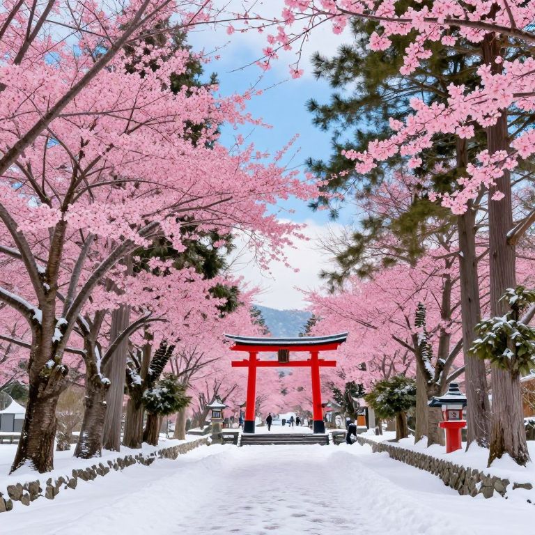 Winter landscape unfolds with vibrant pink sakura blossoms blanketing snow-covered ground, flanked by towering trees and leading to a traditional red torii gate perched atop a stone bridge under a serene blue sky.