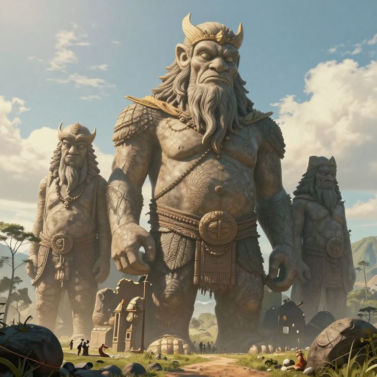 Digital CGI image of three massive, muscular stone giants with horns and armor, standing in a sunlit, cloud-dotted landscape. Small village and figures