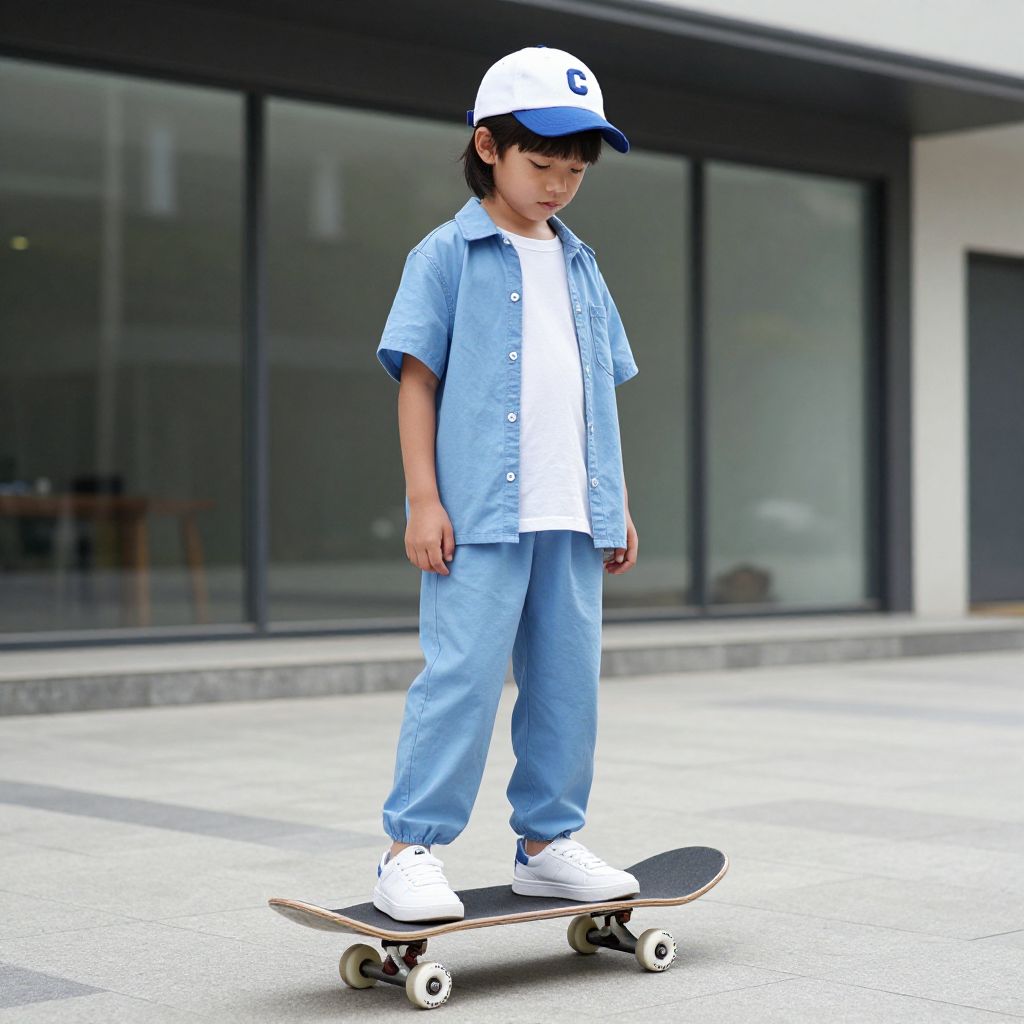 Photograph of a young Asian boy in light blue shirt and pants, white sneakers, and white cap, riding a skateboard outdoors.