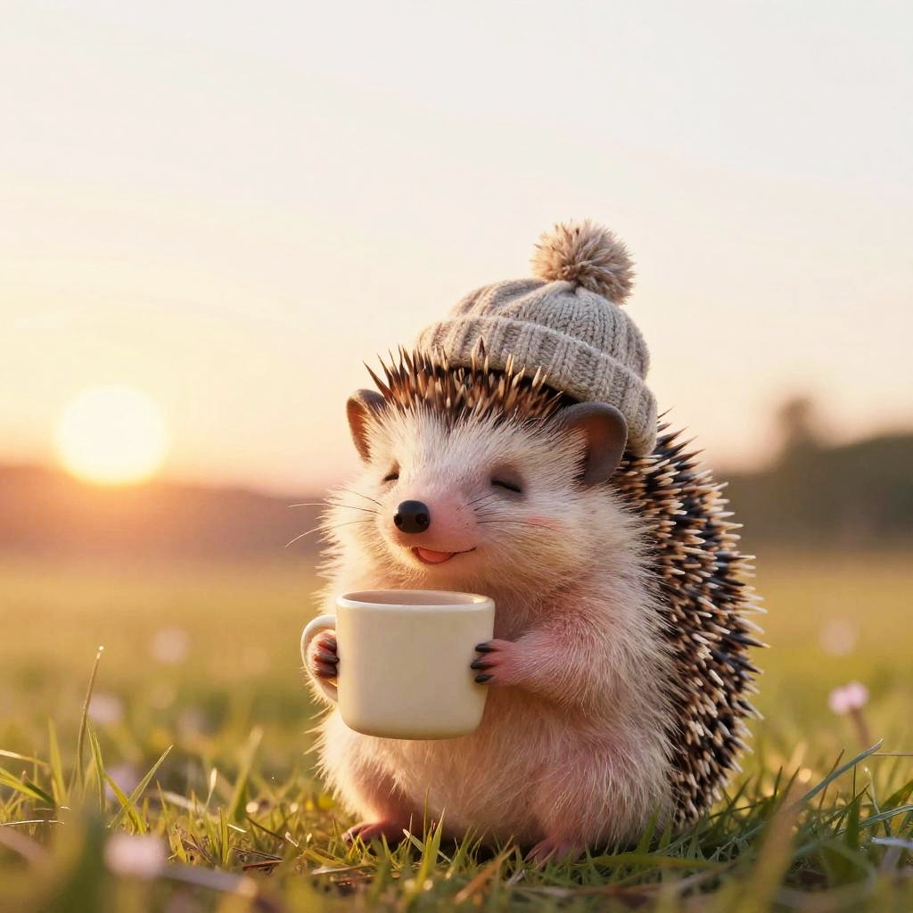 Glossy 3D render of a round penguin chick wearing a tiny scarf, eyes closed and smiling, holding a beige mug with both paws. ice floe with soft morning glow framed with clean negative space so the character is the focal point. Soft textures, friendly whimsical vibe, centered composition, gentle rim light, subtle shadows, high detail, minimal clutter, inviting color palette.