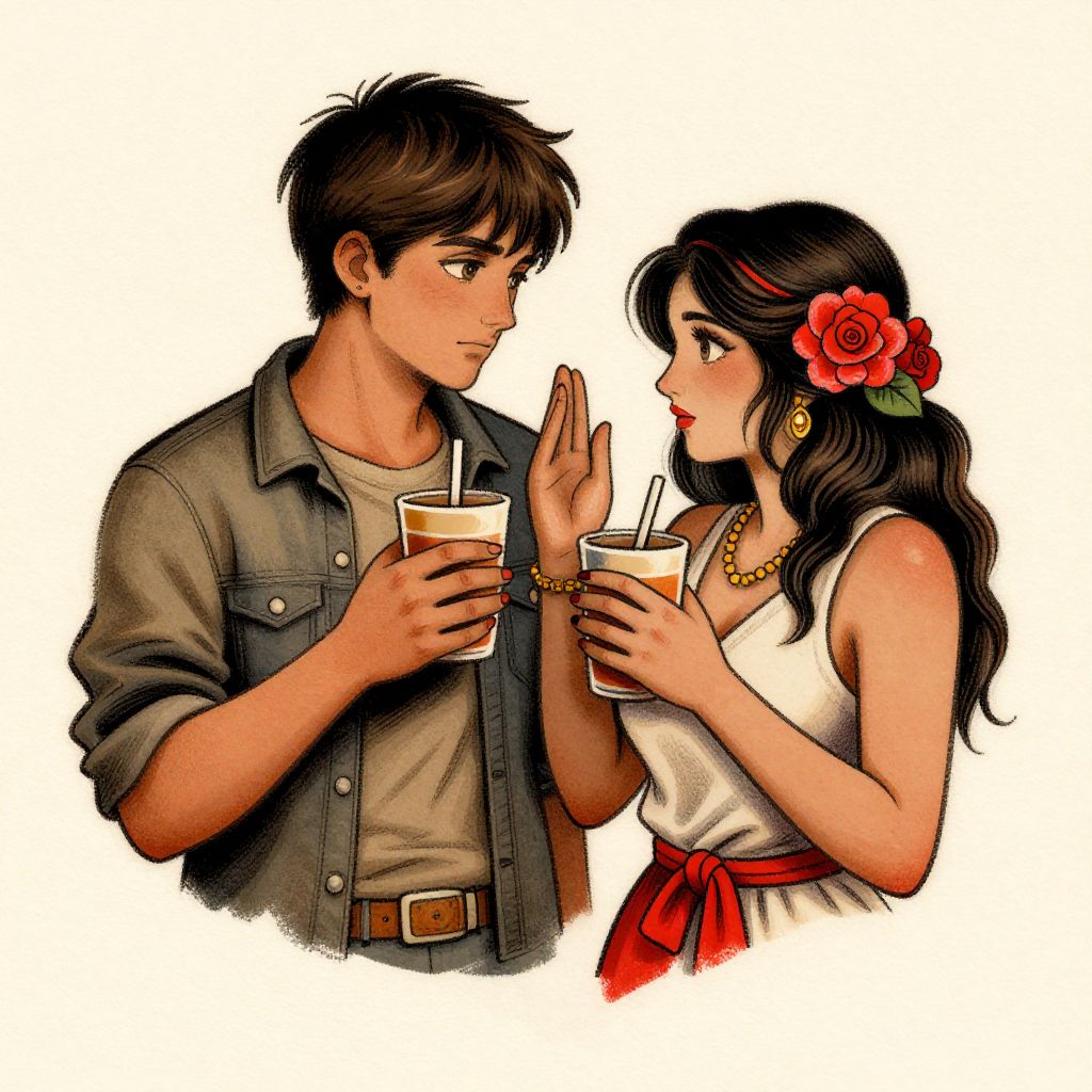This is a digital illustration featuring a young couple. The man, with short brown hair and light skin, wears a gray button-down shirt over a beige t-shirt, holding a drink with a straw. He gazes intently at the woman, his right hand raised in a gesture. The woman, also light-skinned, has long black hair adorned with a red rose. She wears a white sleeveless top with a red skirt and a gold necklace. She holds a similar drink with a straw, looking back at him. The background is plain white, highlighting the couple. The illustration has a vibrant, semi-realistic style with bold colors and clean lines.