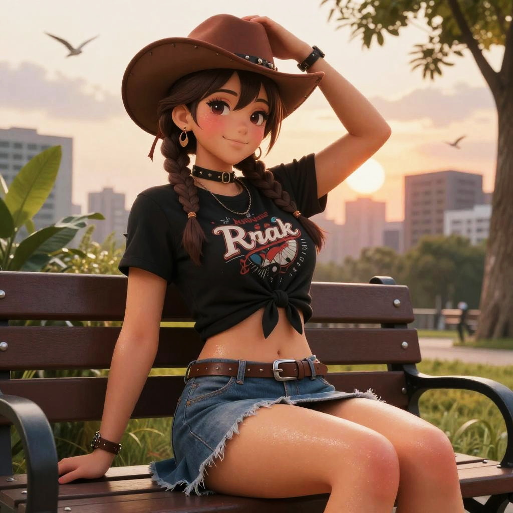 Masterpiece, best quality, absurdres, illustration, 8k, detailed shadows, indricate, blush, skindentation, cowboy shot, ulta-realistic, cute, makeup, eyelashes, eyeshadow, eyeliner, anime eyesBreak RS, 1girl, textured skin, (shiny skin:1.2), curvy, solo, mini skirt, pleated skirt, shops, plants, trees, light smile, printed shirt, choker, earring, hair ribbon, collarbone, short sleeves, wristwatch, small breasts, (black shirt:1.2), braid, parted lips, spikes, looking at viewer, tied up shirt, (midriff:0.8), sitting, bench, city park, stretching, brown hair, thick thighs, leaning backoutdoors, sky, setting sun, cloudy sky, birds