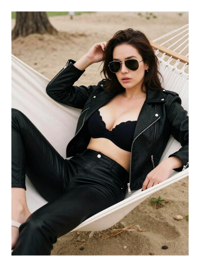 A woman, edgy in a black leather biker jacket and fitted leather pants, wearing aviator sunglasses, relaxing in a beachside hammock, captured in an instant film style. Sexy. Pretty face and beаutiful eyes. Big breasts