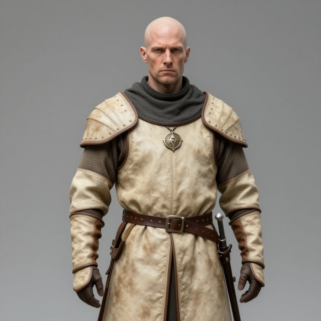 Photograph of a bald, muscular Caucasian man with a stern expression, wearing a medieval-style, beige, leather tunic with brown shoulder guards over a mesh shirt. The tunic is belted with a brown leather strap, and he has a silver cross pendant on the chest. His left hand is partially visible, with a brown glove. The background is a plain, gradient gray, highlighting the character's armor. The lighting is even, casting soft shadows, and the image has a realistic, detailed texture.