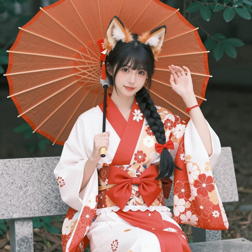 Anime-style photograph of a young woman with fox ears and a large fox tail, wearing a red and white traditional dress with floral patterns, holding an orange parasol. She stands in a bamboo forest, facing right, with long black braids, white lace-up stockings, and a red ribbon in her hair. Green bamboo leaves fill the background.