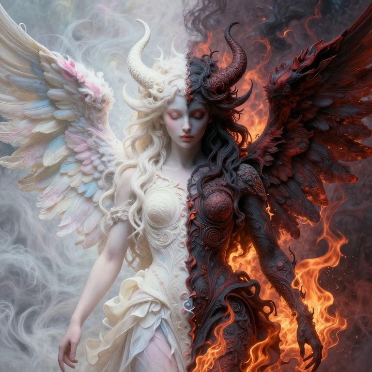 A surreal portrait of a half angel half demon being, showing duality with one side radiating purity and soft pastel hues, the other engulfed in dark flames and rugged textures, intricate patterns blending both realms, fantasy art with ethereal and gothic influences.