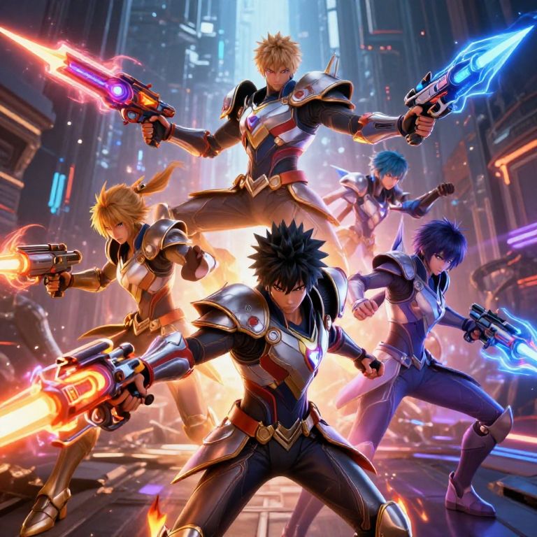 Ai art anime 3d battle scene with multiple characters wielding energy weapons, dynamic poses, intense glowing effects, highly detailed armor and environment, vibrant contrast lighting, cinematic perspective, sci-fi fantasy fusion