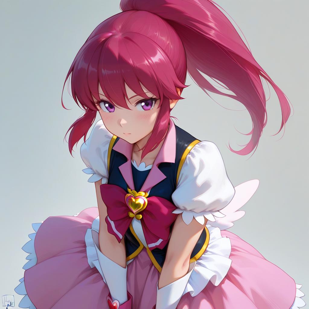 Aino megumi, happinesscharge precure!, 1girl, pink eyes, pink hair, long hair, ponytail, wide ponytail, pink skirt, magical girl, magical girl, heart brooch, by artist nat the lich, illustrious