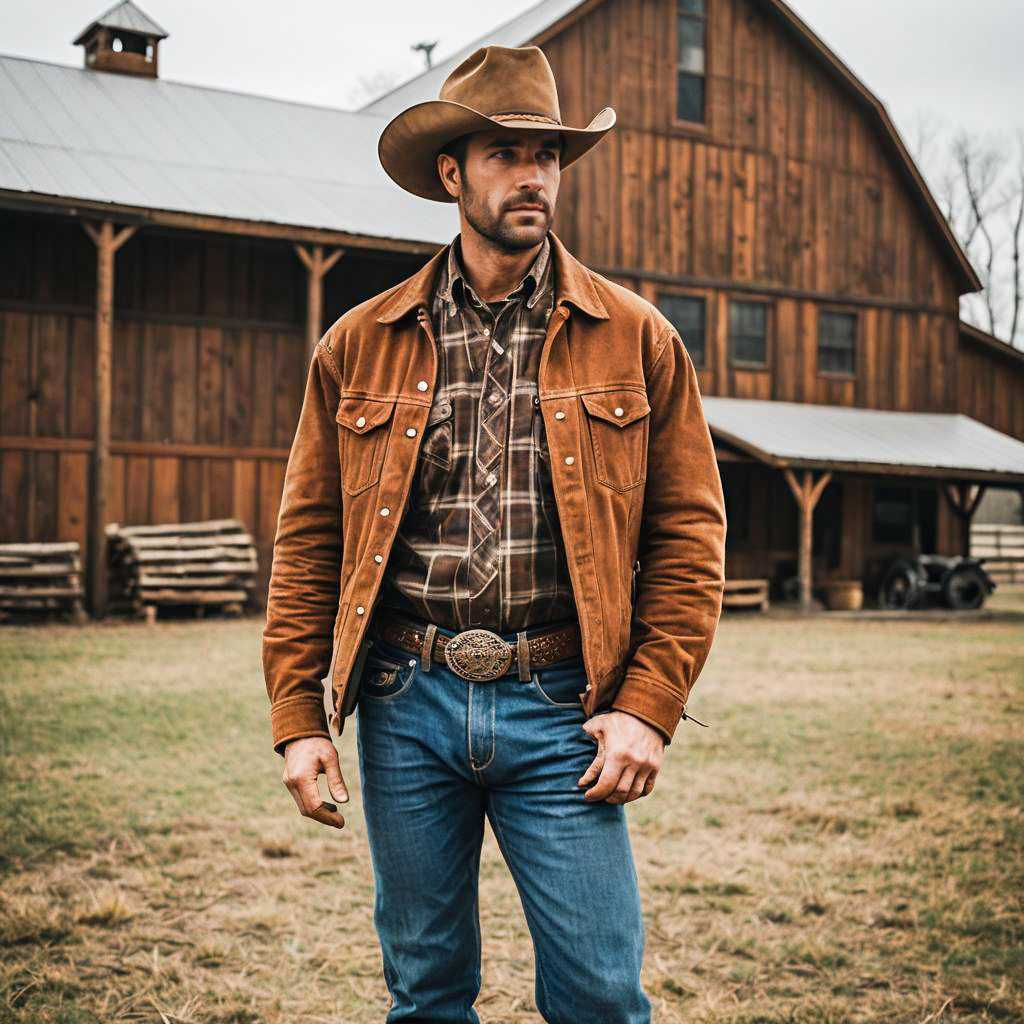 Photo of a Broad Back man, Short Back & Sides, ken cowboy outfit, cowboy hat, suede jacket, plaid shirt, leather boots, blue jeans, western belt, rustic, rugged, classic cowboy style, Burnt Orange earthy tones, casual, masculine, Barn