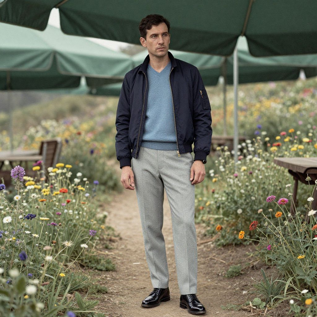 A man, dusty blue cashmere v-neck sweater, tailored light grey trousers, polished black derby shoes, structured navy bomber jacket, lush green canopies, winding trails, vibrant wildflowers, hand-tinted photograph, contemplative expression Man has masculine face and piercing eyes