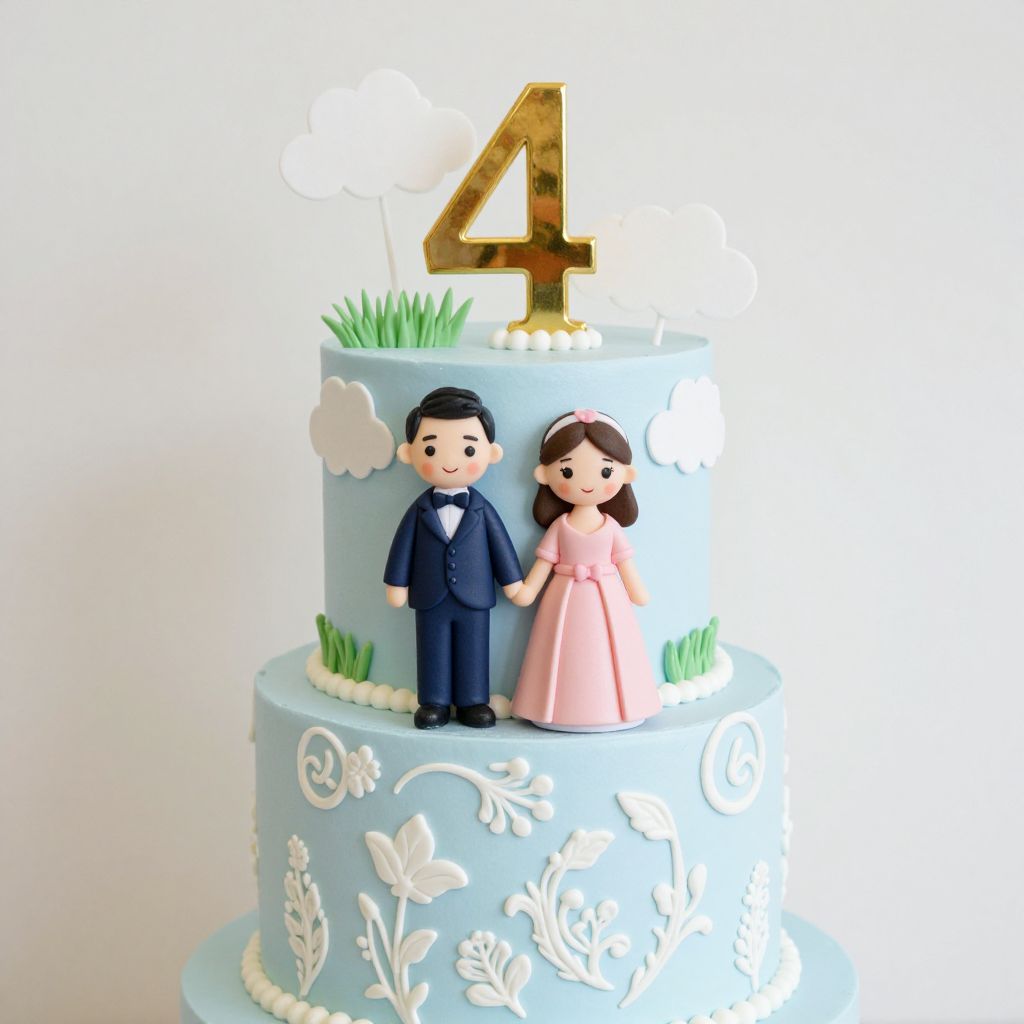 Two-tiered engagement cake by Ame Cakery featuring a light blue top tier decorated with white clouds, green grass, and a gold \"4,\" paired with a bottom tier adorned in intricate white floral patterns, topped by a charming figurine couple—a man in a navy suit and bow tie, and a woman in a pink dress—holding hands.