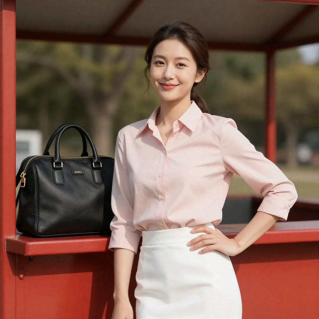 Woman with light pink shirt and white skirt, dark brown hair in an updo, smiling, standing with hand on hip, leaning against red structure with black bags and metal roof in background, bright sunlight, blurred trees in distance, outdoors.