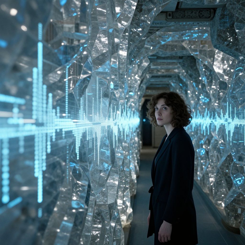 An underground laboratory with a sculpted corridor made of transparent quartz, forming intricate patterns that shift subtly under artificial lighting. A woman with short, curly brown hair and wide, curious eyes stands halfway down the corridor, observing a glowing data stream pulsing along the walls, the setting lit by cool blue and silver halogen lights.