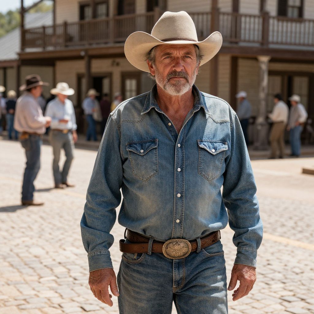A close-up photo of a man in a detailed and colorful 'dude costume' standing in a rustic backyard, wearing a vintage cowboy hat, leather boots, and a patchwork denim jacket with a big red bandana tied around his neck, his face has a warm, weathered expression with a subtle smile, golden hour sunlight filtering through the trees in the background.