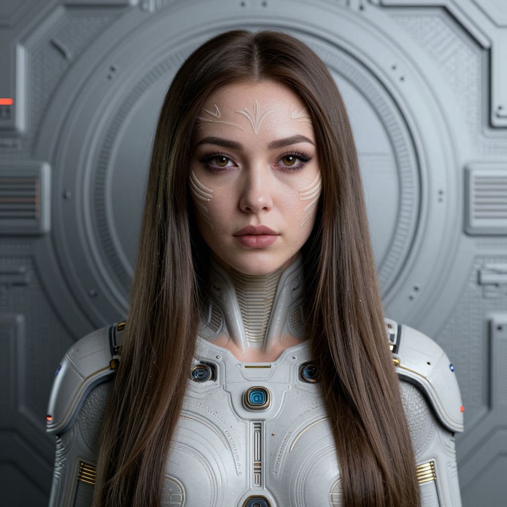 Photograph of a young woman with long, straight brown hair, wearing futuristic, silver armor with intricate patterns and a central blue gem. Her face features white, symmetrical, patterned markings. She has light skin, full lips, and dark, focused eyes. The background is a metallic, circular, industrial-looking wall with textured panels. The image has a sci-fi, high-tech aesthetic, emphasizing her otherworldly appearance and the detailed design of her armor. The lighting is cool, enhancing the metallic and futuristic elements.