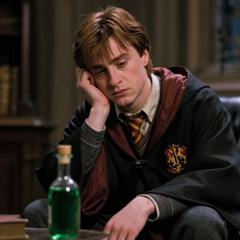 A tired-looking Draco Malfoy, portrayed by Tom Felton, sits contemplatively with a bottle of green liquid, possibly a potion or drug, in a dimly lit room.