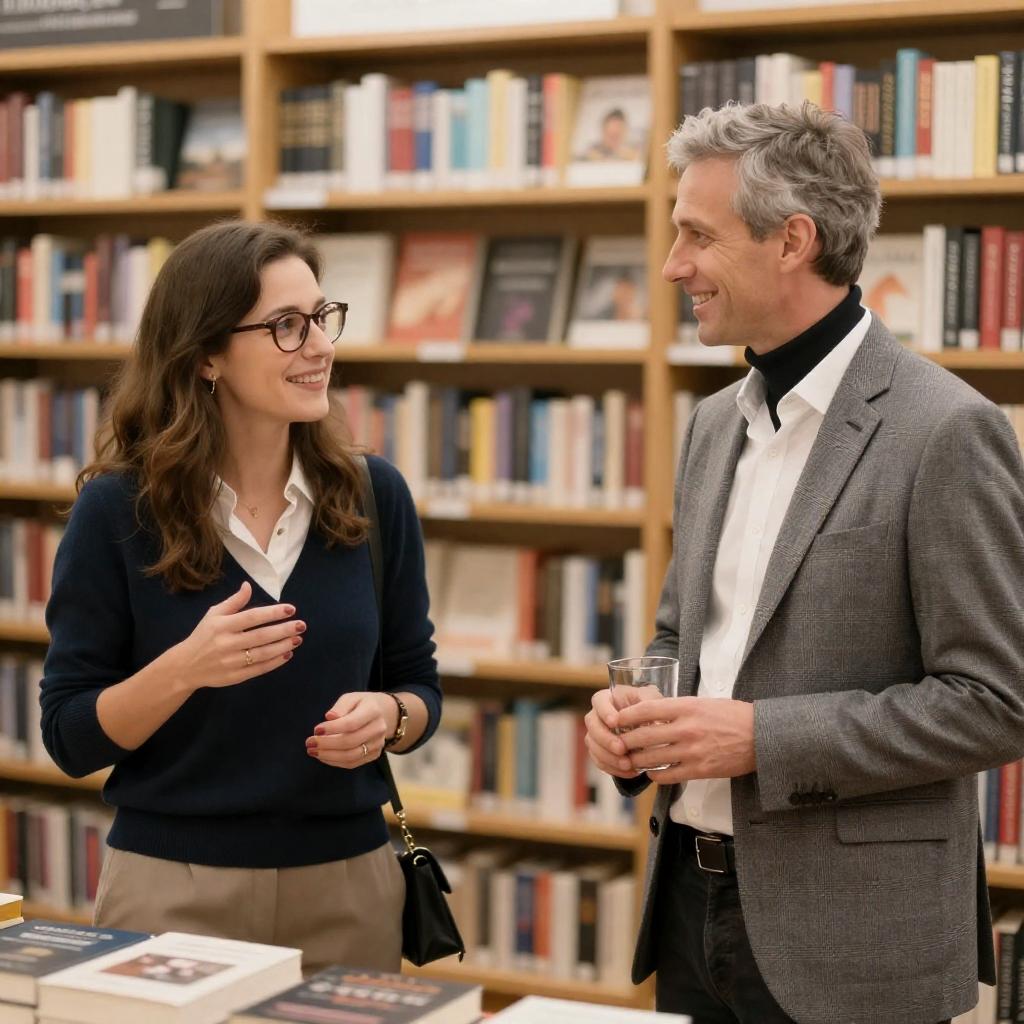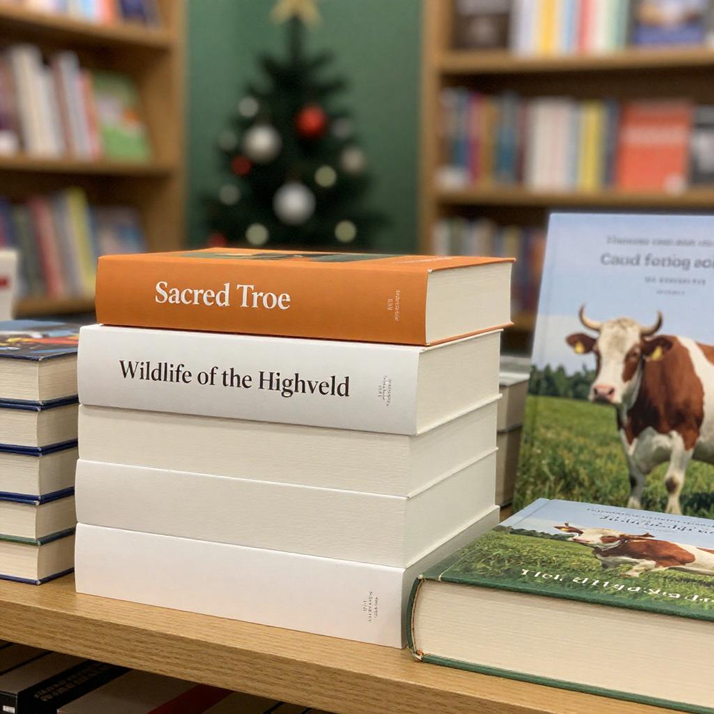 Photograph of a bookstore shelf. Stacked books, including "Sacred Tree" and "Wildlife of the Highveld," with a book featuring a cow on grass on the right. Background: colorful bookshelves, a green wall, and a Christmas tree. Books are primarily white, orange, and green. Wooden shelf. Books are neatly stacked. Christmas tree lights visible in the background.