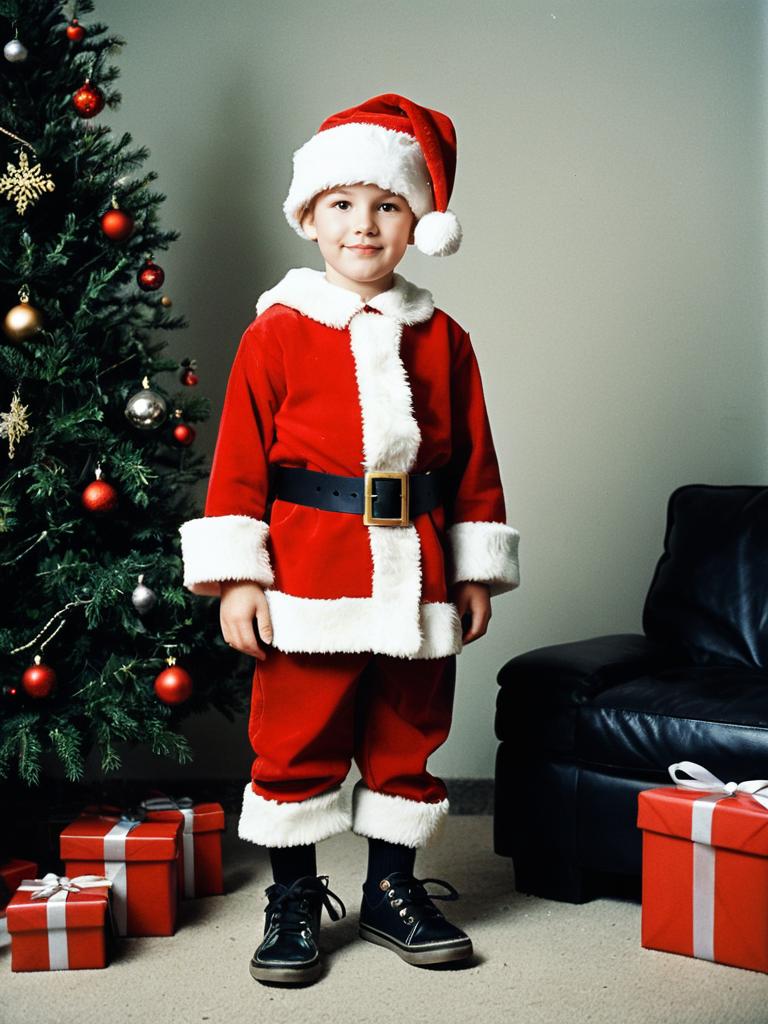 A young boy dressed in a red and white Santa Claus costume, including a Santa hat, black belt, and black shoes, standing indoors next to a decorated Christmas tree and wrapped gifts. The background features a black leather couch and a neutral wall.