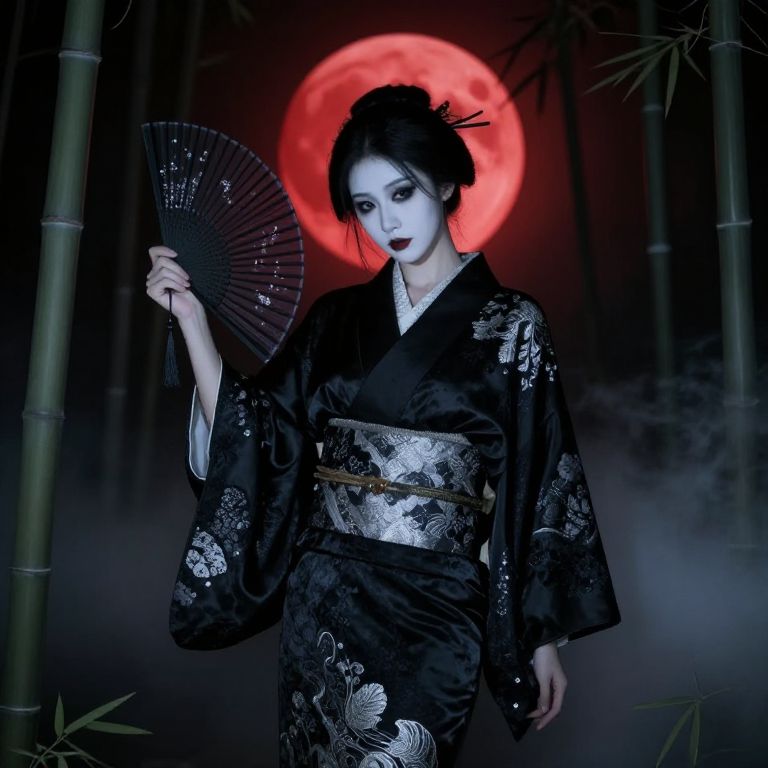 Photograph of a pale-skinned woman in a black floral kimono, holding a fan, against a red moon and bamboo background.