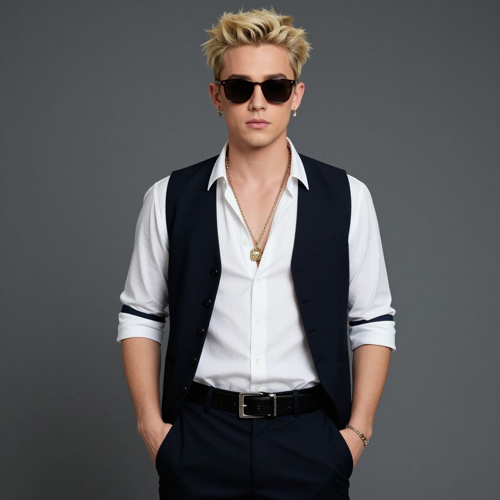 "two piece jazz costume, 1boy, solo, male focus, hat, black pants, pants, shirt, vest, grey background, black headwear, jacket, standing, belt, realistic, short sleeves, fedora Realistic photo of casual sexy person with pretty face"