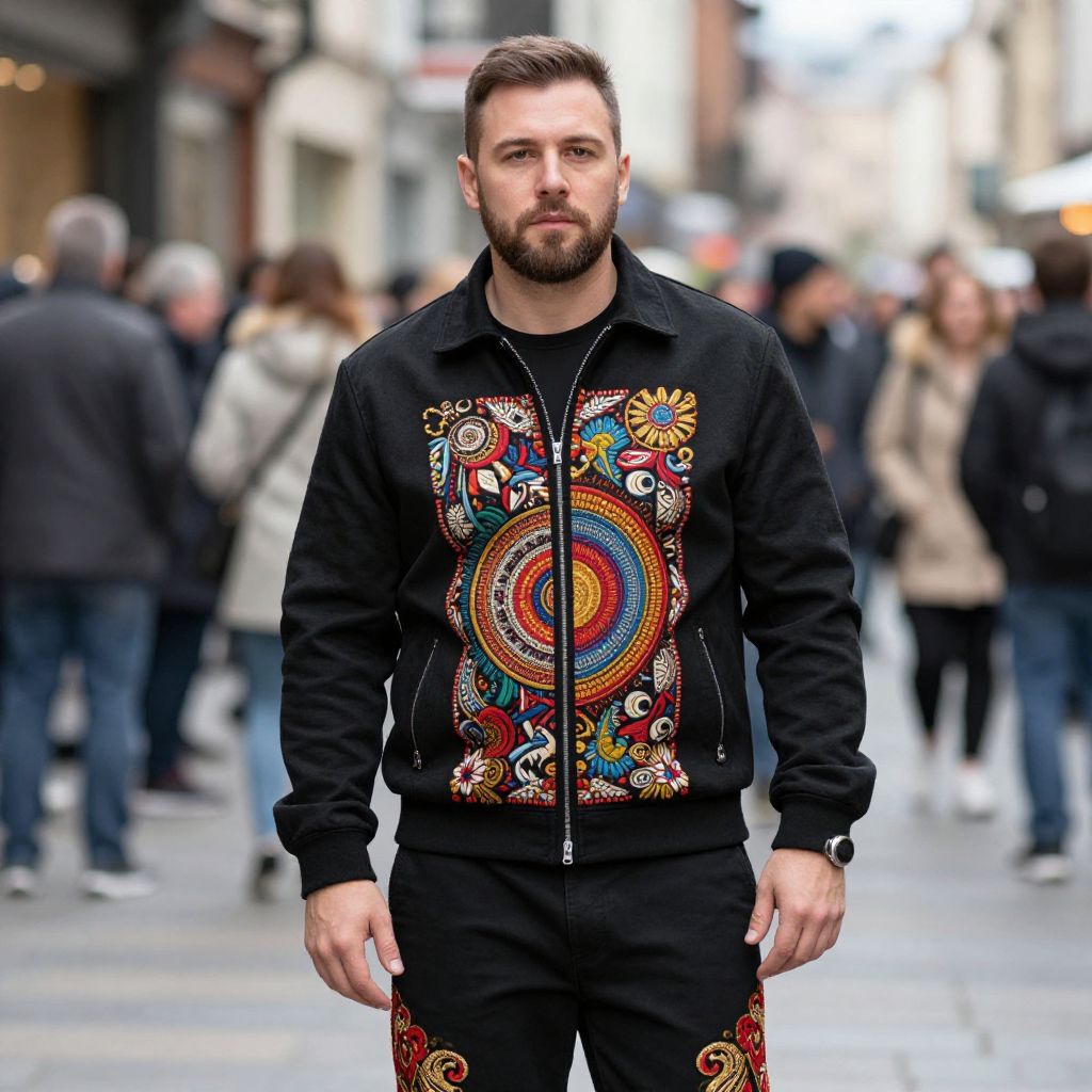 Man wearing a black jacket with a colorful design on the front and black pants with red and gold embroidery on the bottom. The man has short brown hair and a beard. He is standing on a street with a crowd of people in the background.