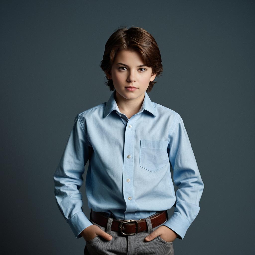 A young boy with brown hair wearing a light blue long-sleeve collared shirt and grey pants with a brown belt. He stands confidently with hands in pockets against a plain dark background, looking directly at the viewer with a neutral expression.