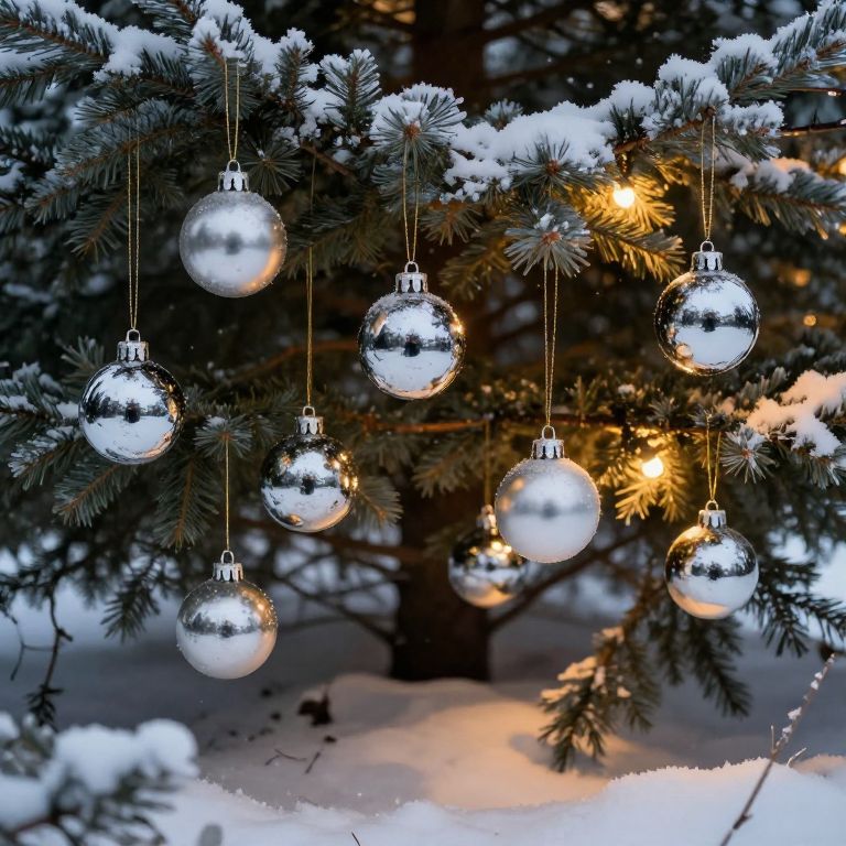 Photograph of a snow-covered evergreen tree adorned with nine shiny, silver Christmas ornaments hanging from thin, silver strings. The tree's branches are dusted with fresh, white snow, and warm, yellow fairy lights are wrapped around some of the branches, creating a glowing contrast against the dark, wintry background. The ornaments reflect the surrounding light, adding a sparkle to the image. The snow on the ground is softly illuminated by the tree lights, enhancing the festive, wintery atmosphere. The overall scene exudes a serene and magical holiday feeling.