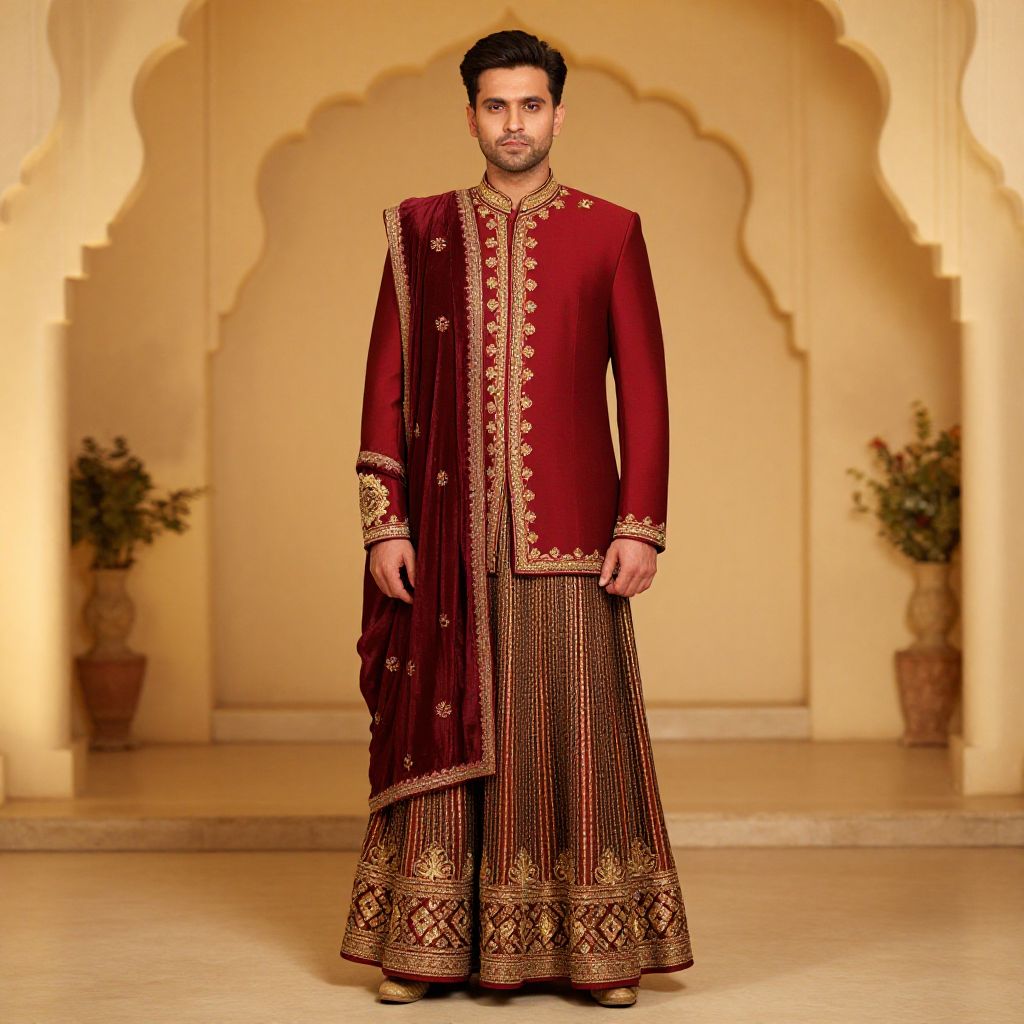 "Sherwani Dulhe Dress, a man in a maroon and gold sherwani with a red jacket"