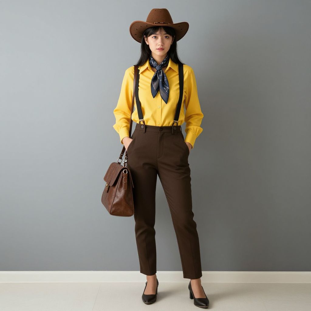 Photograph of an Asian woman standing against a plain gray wall. She has long black hair, fair skin, and wears a brown cowboy hat, yellow button-up shirt, dark brown high-waisted pants with suspenders, and a black neckerchief. She carries a brown leather handbag in her left hand and wears black pointed-toe flats. Her expression is neutral, and she stands with a slight forward lean. The lighting is bright and even, highlighting her stylish, retro-inspired outfit. The background is simple and uncluttered, focusing attention on her attire and pose.