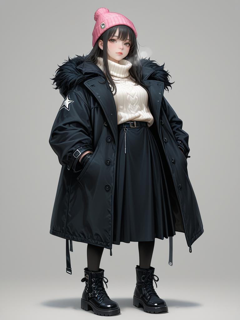 1girl, realistic face, full body shot, Woman, winter chic, oversized black down puffer coat, mid-calf length, wide horizontal quilting, large puffed collar, cuffed sleeves, white knitted sweater with central black star motif, A-line black midi skirt, opaque black leggings, chunky black boots with ridged soles, black gloves, pink beanie, studio background.
