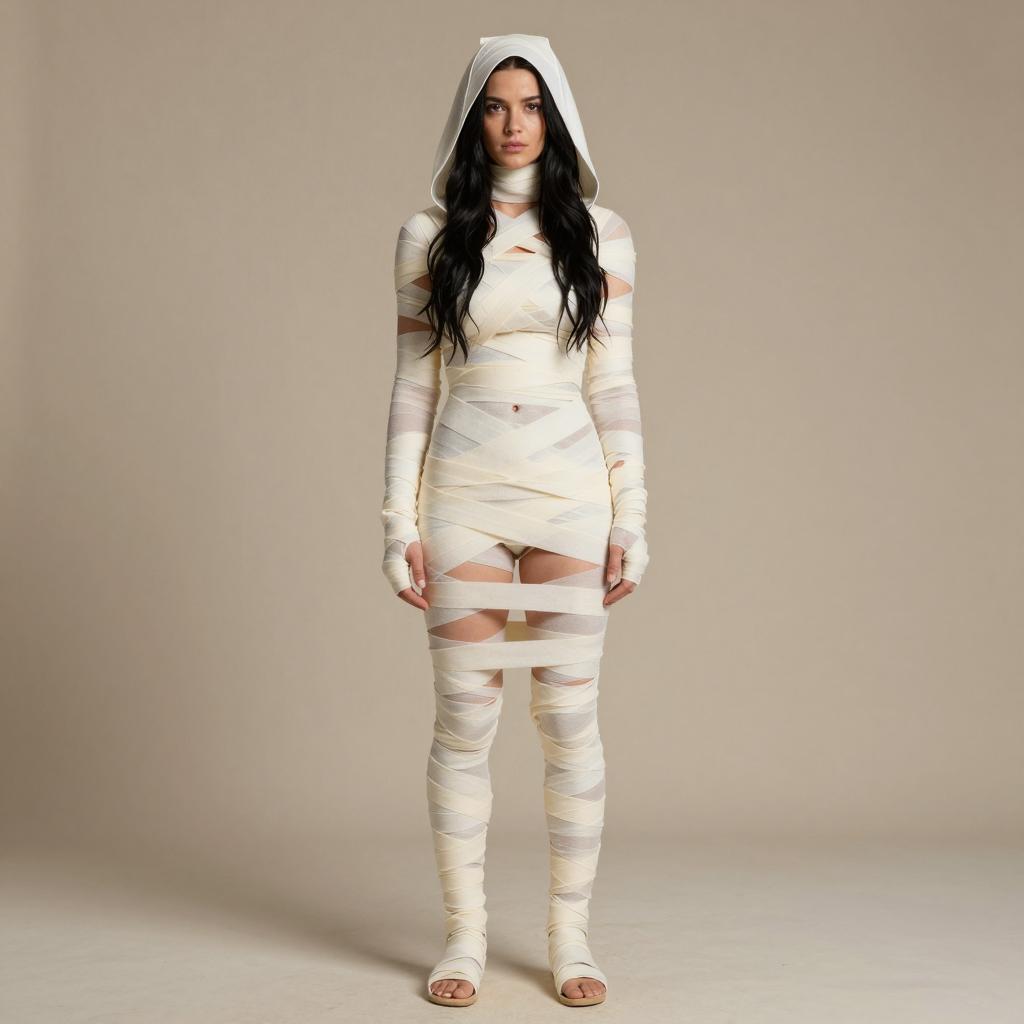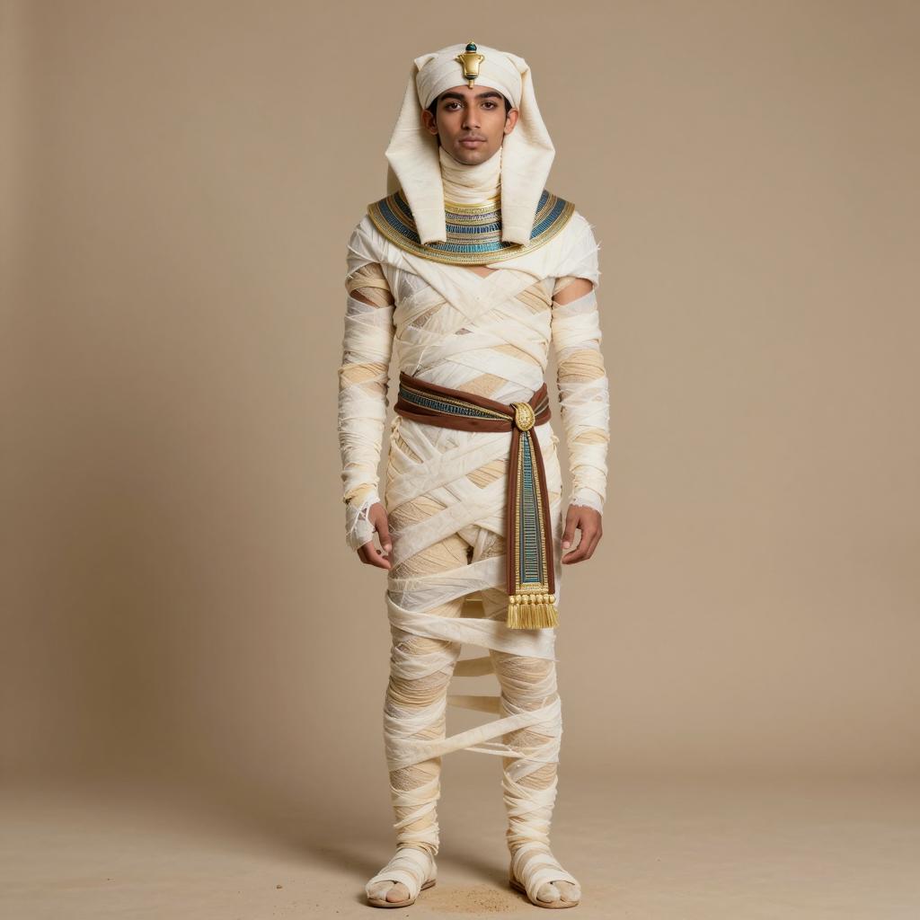 Homemade egyptian mummy, photorealistic portrait of young Middle Eastern man, wearing traditional desert clothing, white and beige wrapped robes, brown and gold patterned sash, neutral expression, brown eyes, light brown skin, sandy background, full body, slight shadow, soft lighting, vertical composition, realistic ures, traditional attire, focused gaze, symmetrical framing