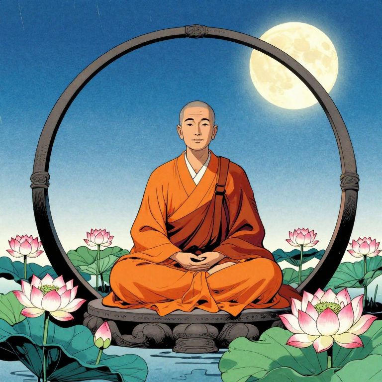 Digital illustration of a bald Buddhist monk in an orange robe, meditating in a black circular frame surrounded by pink lotus flowers and a full moon in